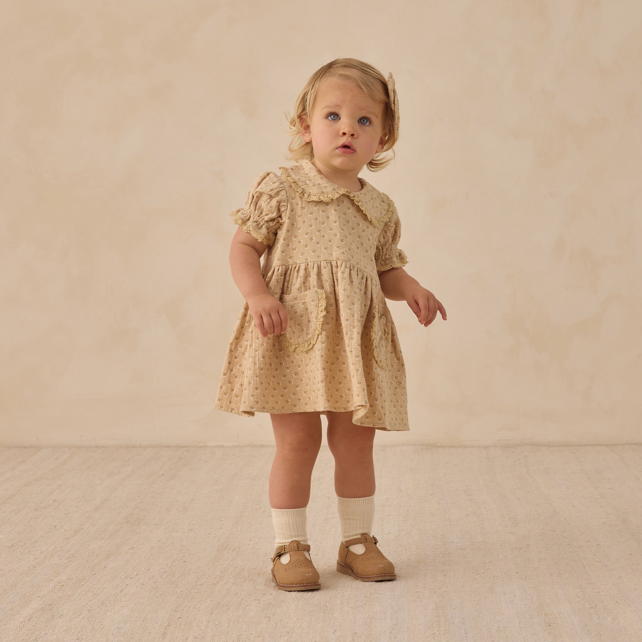 Our Marisol Dress features a Peter Pan collar, patch pockets, and full gathered short sleeves—all adorned with delicate lace ruffle trim—and coconut buttons at the back for easy dressing. Coordinating bloomers included with all sizes.